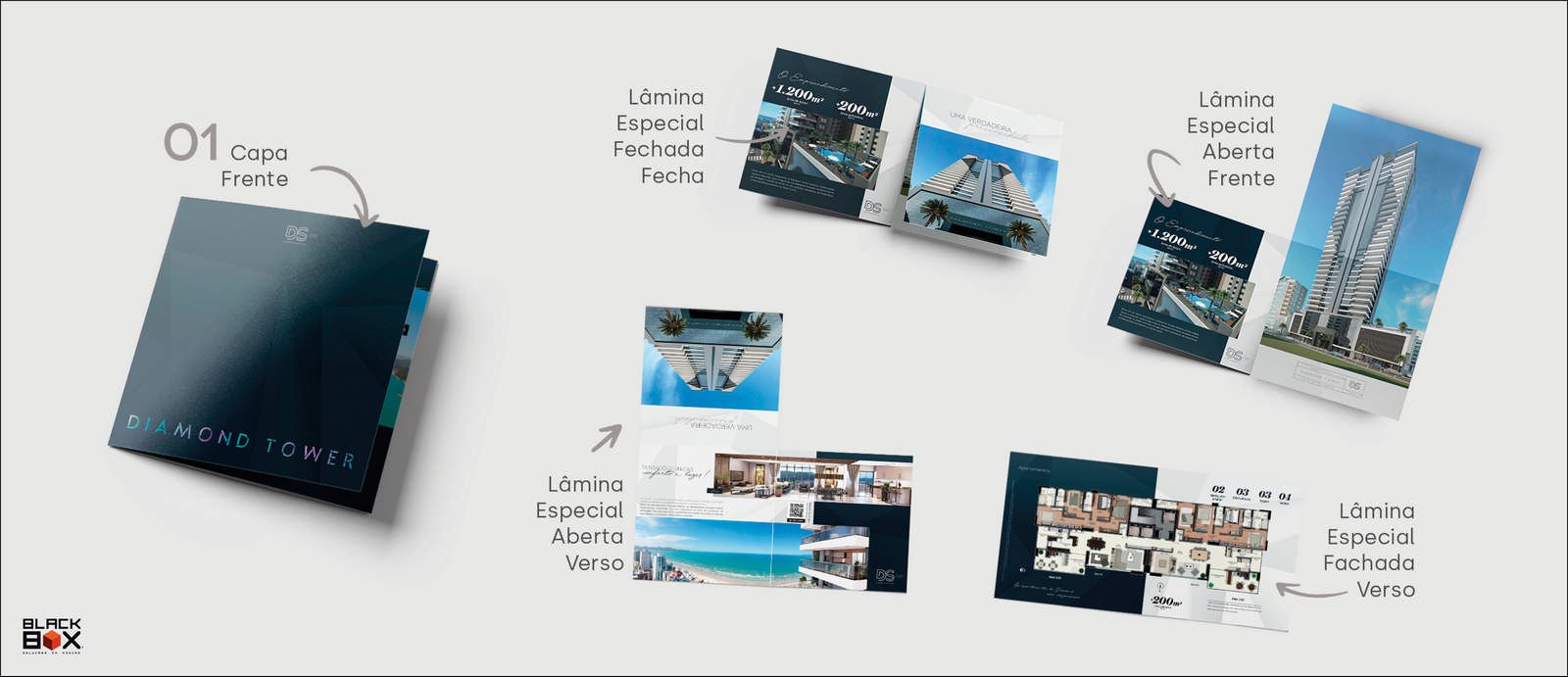 Sugerimos um catalogo de 24 páginas com lamina maior na fachada e um material de apoio mais completo para o Diamond Tower, que pode ser utilizado em eventos e apresentações mais rapidas. O material sempre fala da busca pela felicidade, desde as suas características até os seus diferenciais, além de imagens que ilustram a beleza e a sua elegância de forma eficiente e simples.