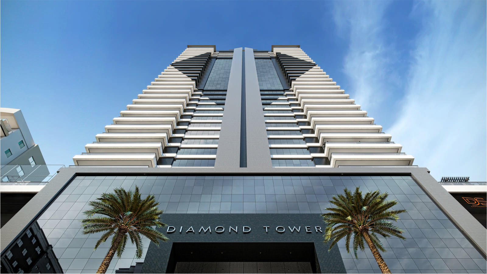 A logo do Diamond Tower apresenta linhas retas e angulares, permitindo sua aplicação harmoniosa na fachada do mesmo. A referência às facetas do diamante simboliza qualidade e sofisticação.